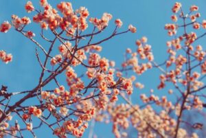 elf girl hiding -or shall I say, trying to hide – in the flower garden, under that pink blossomed tree?”