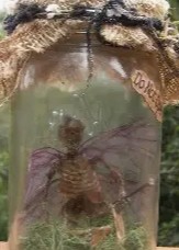 dinosaur hide books, glass terrariums with bugs and dried fairy pucks