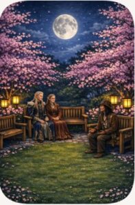 crouching in the dark, below a Cherry Blossom Willow-wisp tree, her tall for a young girl body, wrapped in green leather armor, hidden, but not well. And I could faintly hear her mumbling to herself.