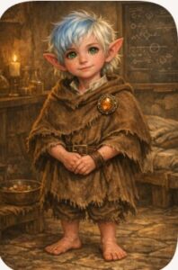 Pips story is a bit different. Pip was a small boy shorter than a yard stick when the Fiery Fey brought him to Padre. The “nice” goblins didn’t want anything to do with him because he was the “wrong color” and did not smell like a goblin.