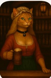 the gray and black tabby, who is a member of the Carny’s guild, is manning the two apartment hallways of my inn today. Mara, the hobbit woman, took a personal day. Maybe she’ll be at the wake. Not sure. Some of the garden and cleaning staff will attend, some won’t. Knowing Anya,