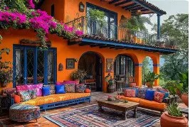 Each of the four walls are painted a different color. One wall is neon light green, the other wall is fruity orange, the next wall is painted burgundy, and the last wall is painted indigo blue. On top of the structure, but barely visible behind the false façade of an open Pueblo roof, is a second story living area.