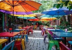 Inside, the wall colors are exactly the same as the outer wall, with the same contrasting trim colors. Several glass patio tables with bold and blindingly bright umbrellas are scattered around the building, just passed the added premium back patio area. Five patio sets topped by the same bold and radiantly dazzling colorful umbrellas are located inside The Latino Burrito café as well.